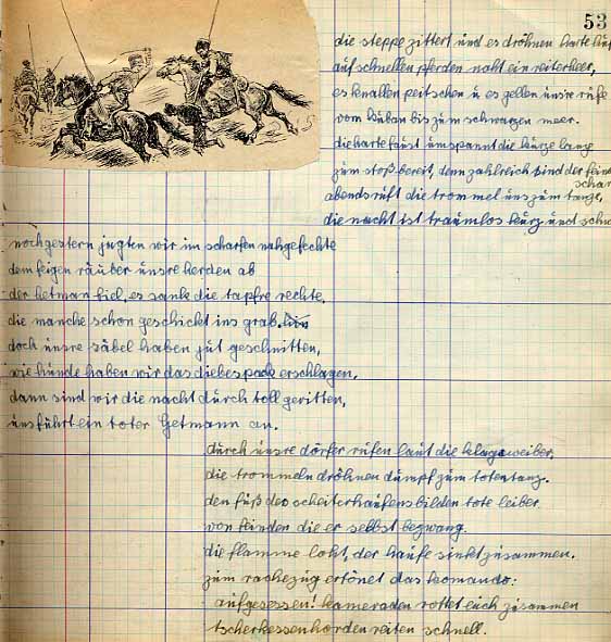 Die Steppen zittern und es gellen laute Rufe, von ferne naht ein Reiter her. Es knallen Peitschen und es gellen laute Rufe, Vom Kuban bis zum Schwarzen Meer. Die harte Faust umspannt die kurze Lanze, zum Stoß bereit, denn zahlreich sind des Feindes Scharen. Abends ruft die Trommel uns zum Tanze, die Nacht ist traumlos, kurz und schwer.