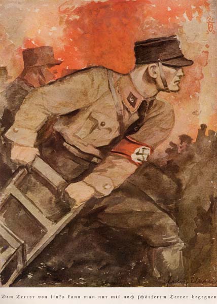 Die nationalsozialistische Bewegung unterhielt seit 1920 einen Ordnerdienst zur gewaltsamen Auseinandersetzung mit politischen Gegnern bei Saal- und Straßenschlachten. Aus bewährten Mitgliedern dieses Schlägertrupps entstand im November 1921 die braun uniformierte "Sturmabteilung" (SA). Bis zu ihrem vorübergehenden Verbot nach dem gescheiterten Hitler-Putsch vom 9. November 1923 wurde die SA von rechtsradikalen Offizieren der Freikorps ausgebildet. Während des "Ruhrkampfes" wurde sie von der Reichswehr in die Landesverteidigung einbezogen.