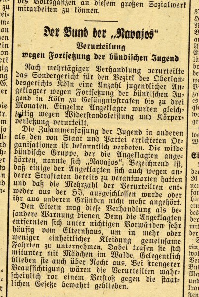 Der "Westdeutsche Beobachter" berichtet: "Die Zusammenfassung der Jugend in anderen als den von Staat und Partei errichteten Organisationen ist bekanntlich verboten. Die wilde bündische Gruppe, der die Angeklagten angehörten, nannten sich 'Navajos'. Bezeichnend ist, daß einige der Angeklagten sich auch wegen anderer Straftaten bereits zu verantworten hatten und daß die Mehrzahl der Verurteilten entweder aus der HJ ausgeschlossen wurde oder ihr aus anderen Gründen nicht mehr angehört. Den Eltern mag diese Verhandlung als besondere Warnung dienen. Denn die Angeklagten entfernten sich unter nichtigen Vorwänden sehr häufig vom Elternhaus, um in mehr oder weniger einheitlicher Kleidung gemeinsame Fahrten zu unternehmen. Dabei trafen sie sich mitunter mit Mädchen im Walde. Gelegentlich blieben sich auch über Nacht aus. Bei strengerer Beaufsichtigung wären die Verurteilten wahrscheinlich vor einem Verstoß gegen die staatlichen Gesetze bewahrt geblieben."